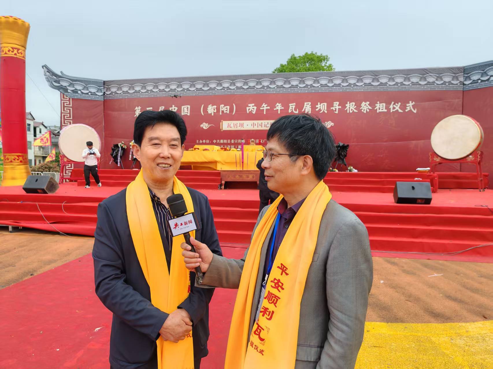 图说:香港共工新闻社总编办副主任、记者廖红麟就“瓦屑坝在中华文明传承中的历史坐标意义”话题,采访鄱阳县委原常委、统战部部长汪天水。共工社 发